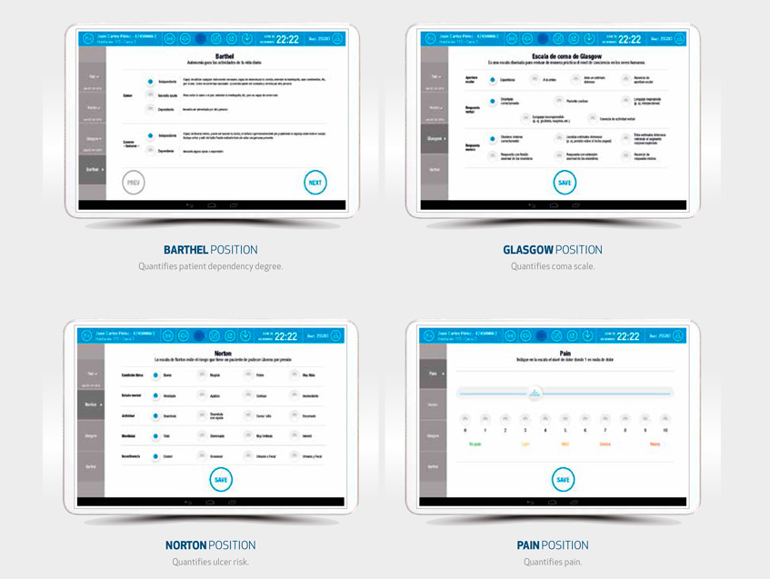 We have implemented measurement scales on our interface to determine the patient’s required nursing level of care (NLC*): pain level, ulcer risk, state of consciousness, patient’s dependency degree, etc. medip integrates standardized scales such as Pain, Barthel’s, Norton’s or Glasgow’s, and it also allows personalized scales to be generated. Knowledge of the patient’s status facilitates the determination of the level of care they require.